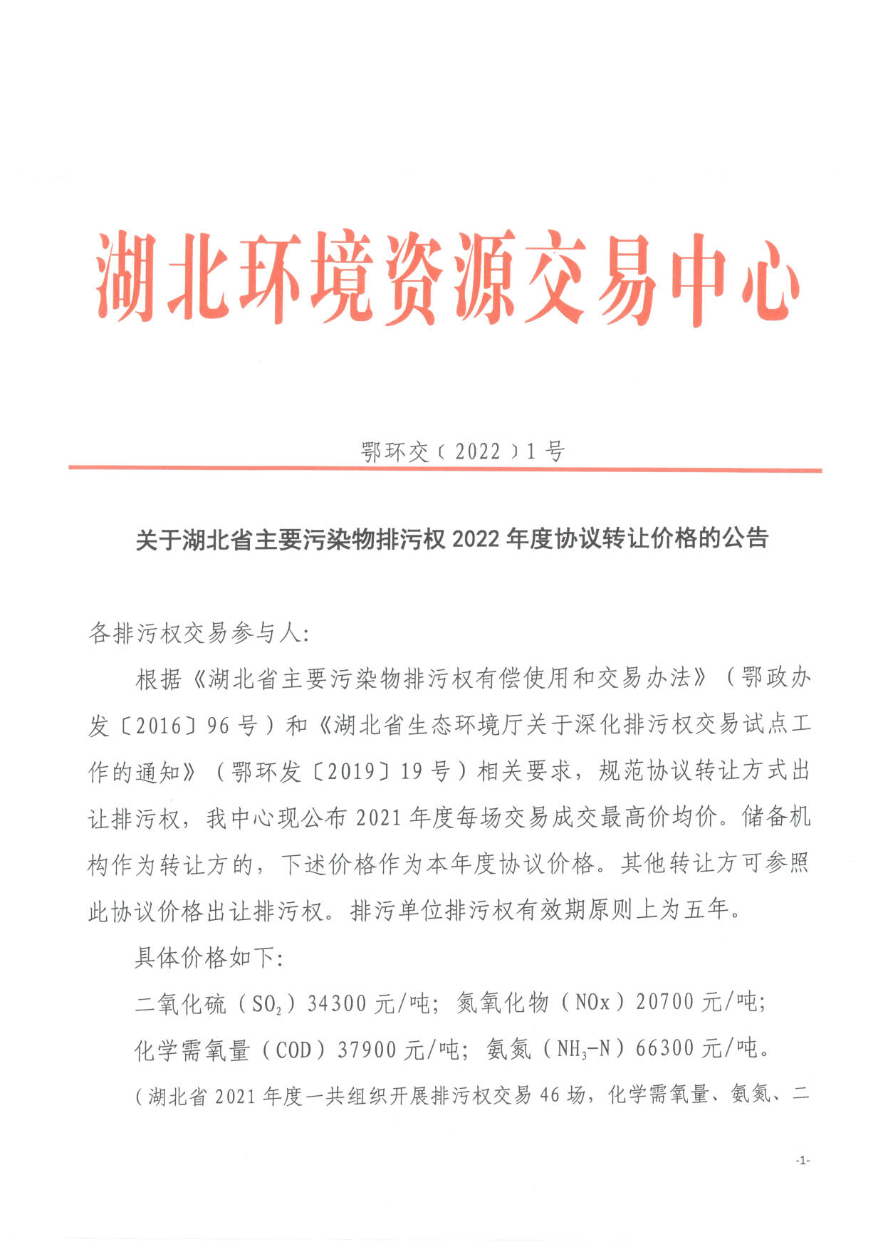 名       称: 关于湖北省主要污染物排污权2022年度协议转让价格的公告 发布日期: 2022年01月21日